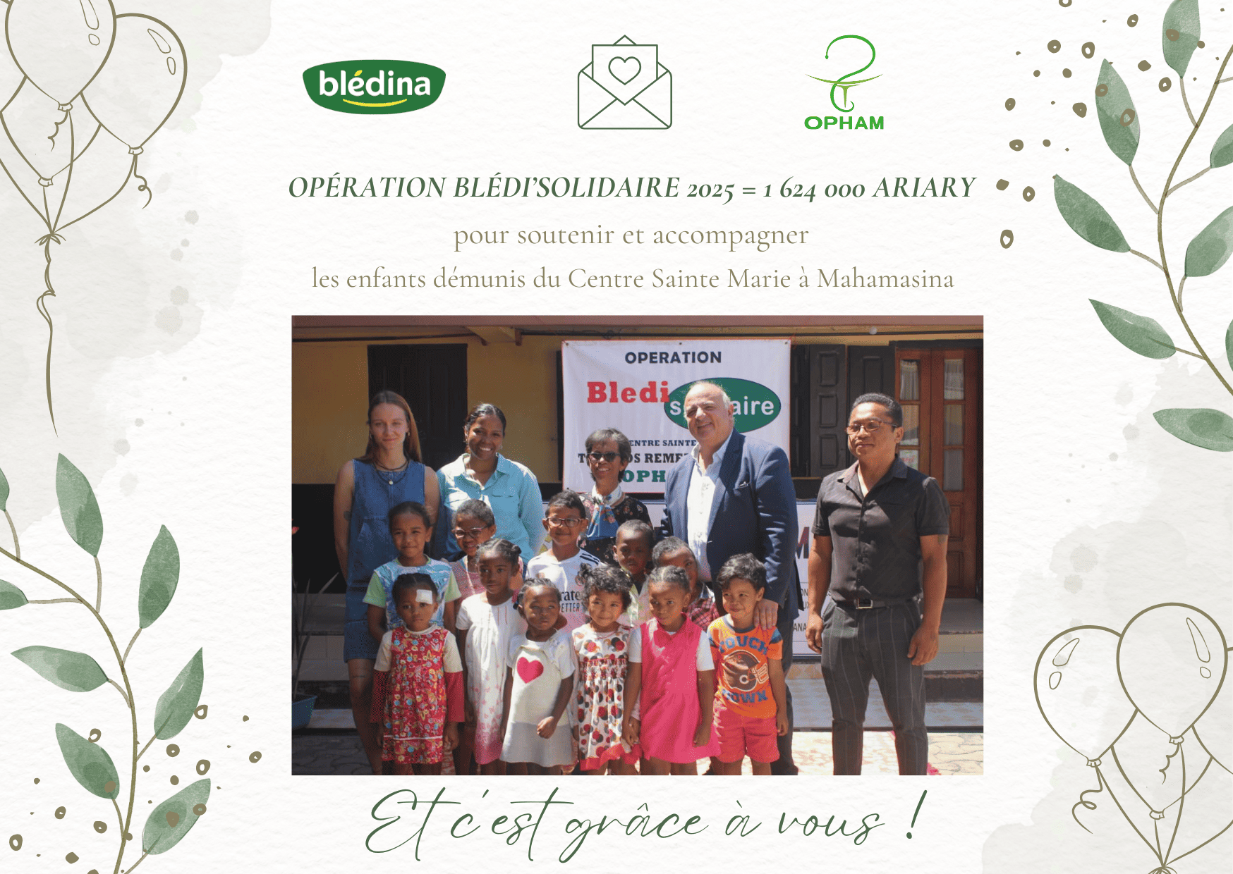 L’opération Blédi’Solidaire consiste pour OPHAM et S2M, à verser 2 000 ariary au Centre Sainte Marie pour chaque boite vendue. La somme totale récoltée 1 624 000 ariary a été reversée à l’ONG afin de soutenir leurs actions en faveur des enfants et familles démunies, dont leur réinsertion sociale et l’amélioration de leurs conditions de vie.